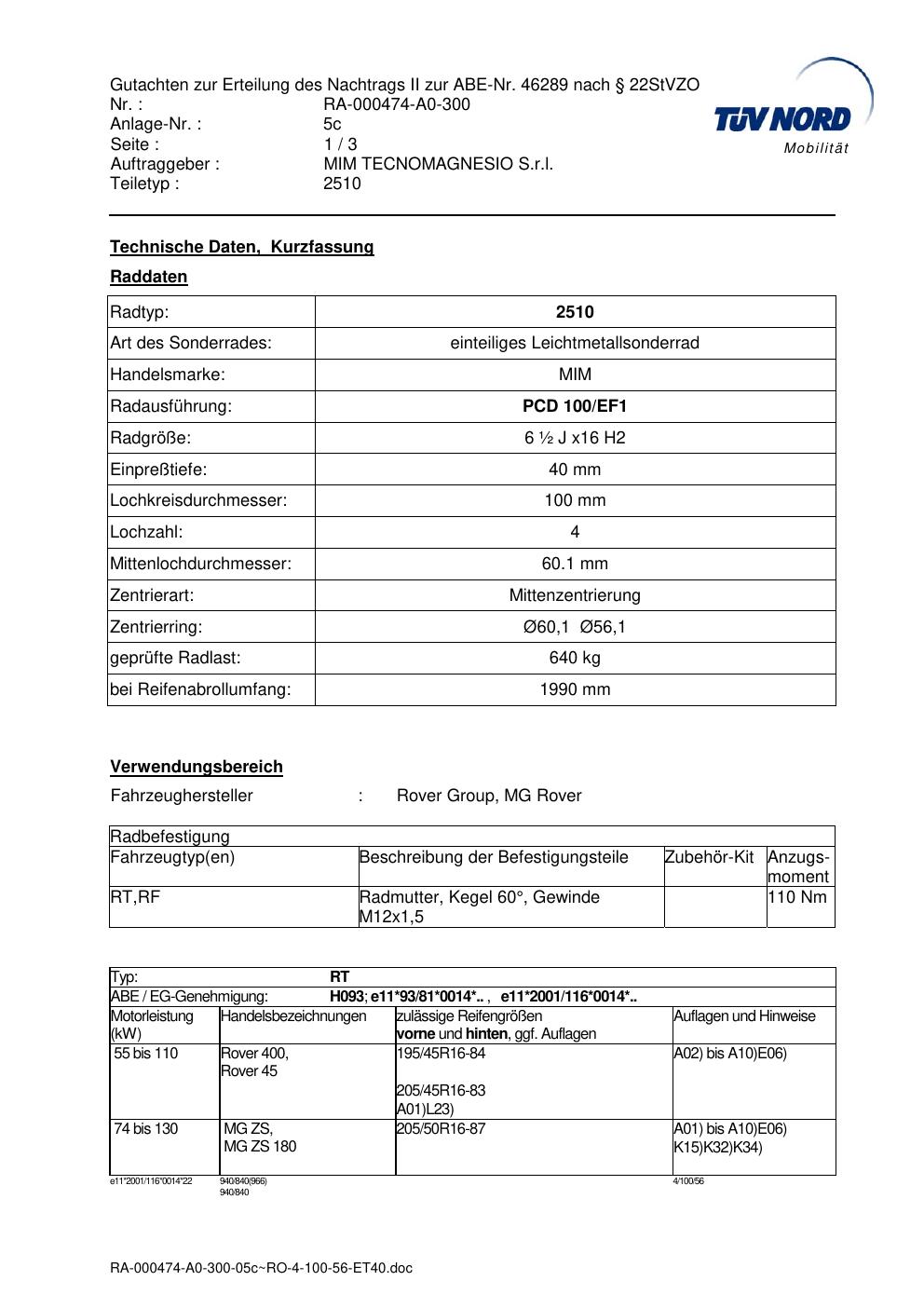 Dieses Gutachten (abe) bezieht sich auf die Alufelge MIM 2510 in der Ausführung ET 0, Mittenloch 0 mm (KBA 46289). Im PDF findest du typischerweise zulässige Reifengrößen, Auflagen/Anbauhinweise und – je nach Dokument – Hinweise zur Eintragung.