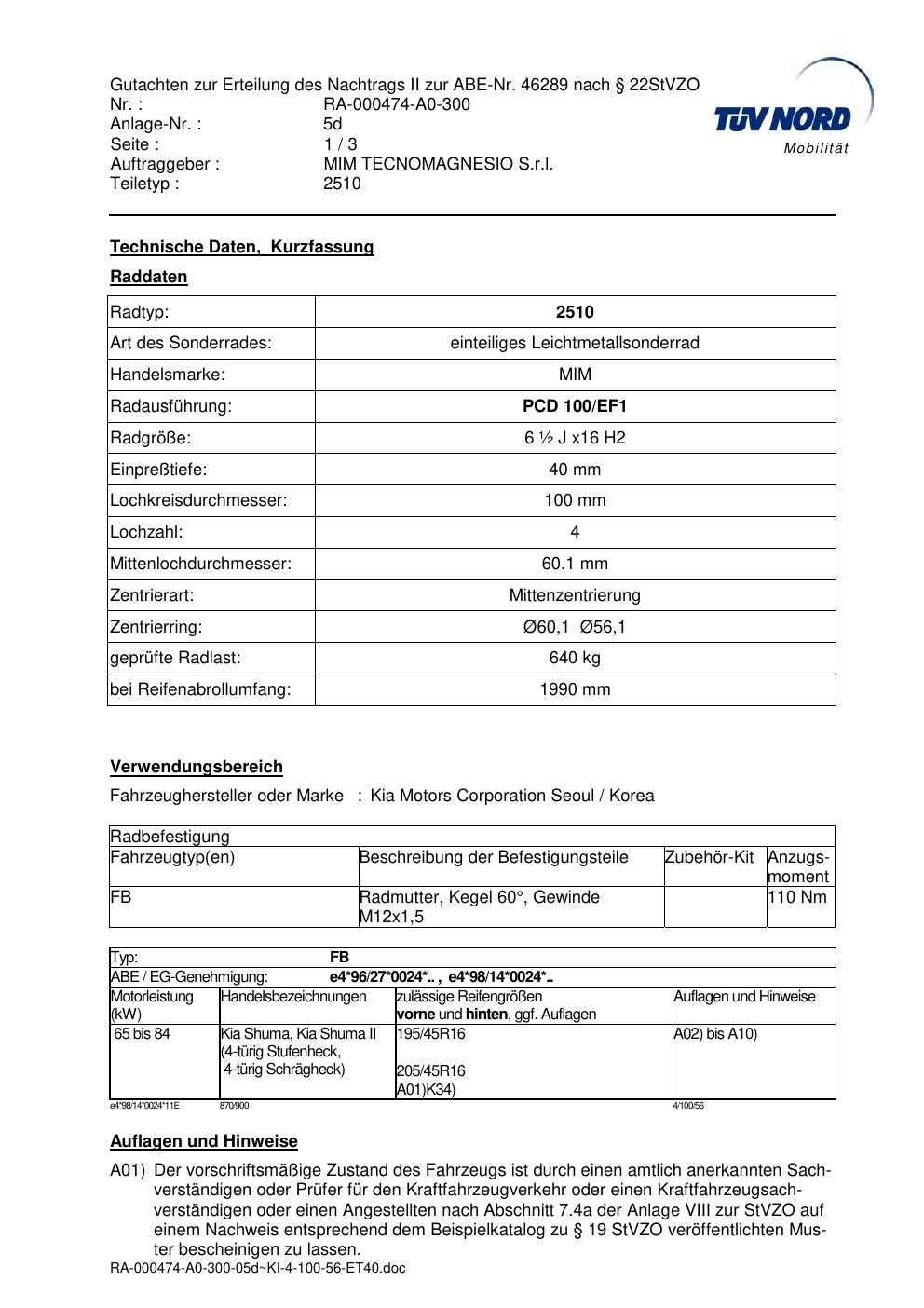 Dieses Gutachten (abe) bezieht sich auf die Alufelge MIM 2510 in der Ausführung ET 0, Mittenloch 0 mm (KBA 46289). Im PDF findest du typischerweise zulässige Reifengrößen, Auflagen/Anbauhinweise und – je nach Dokument – Hinweise zur Eintragung.