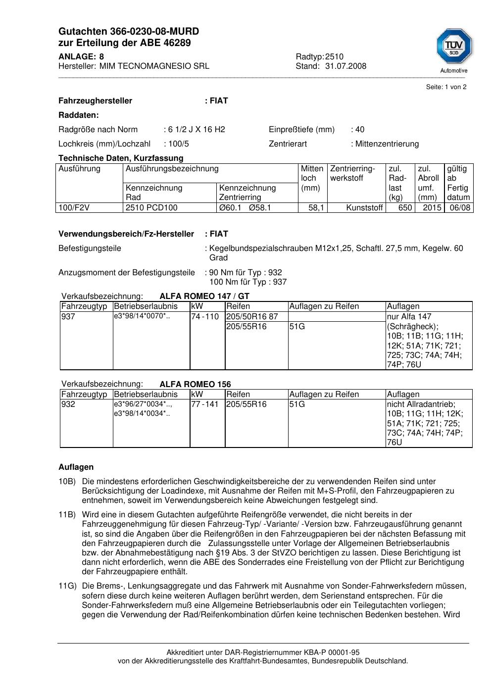 Dieses Gutachten (abe) bezieht sich auf die Alufelge MIM TECNOMAGNESIO SRL 2510 in der Ausführung ET 0, Mittenloch 0 mm (KBA 46289). Im PDF findest du typischerweise zulässige Reifengrößen, Auflagen/Anbauhinweise und – je nach Dokument – Hinweise zur Eintragung.