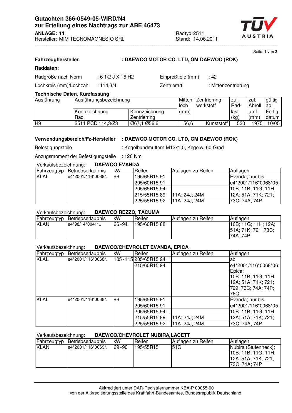 Dieses Gutachten (abe) bezieht sich auf die Alufelge MIM 2511 in der Ausführung ET 0, Mittenloch 0 mm (KBA 46473). Im PDF findest du typischerweise zulässige Reifengrößen, Auflagen/Anbauhinweise und – je nach Dokument – Hinweise zur Eintragung.