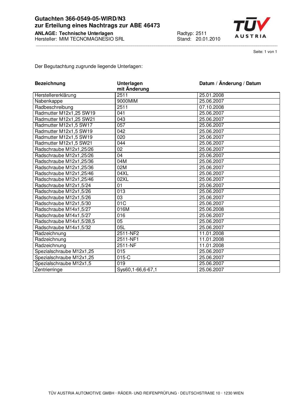 Dieses Gutachten (abe) bezieht sich auf die Alufelge MIM 2511 in der Ausführung ET 0, Mittenloch 0 mm (KBA 46473). Im PDF findest du typischerweise zulässige Reifengrößen, Auflagen/Anbauhinweise und – je nach Dokument – Hinweise zur Eintragung.