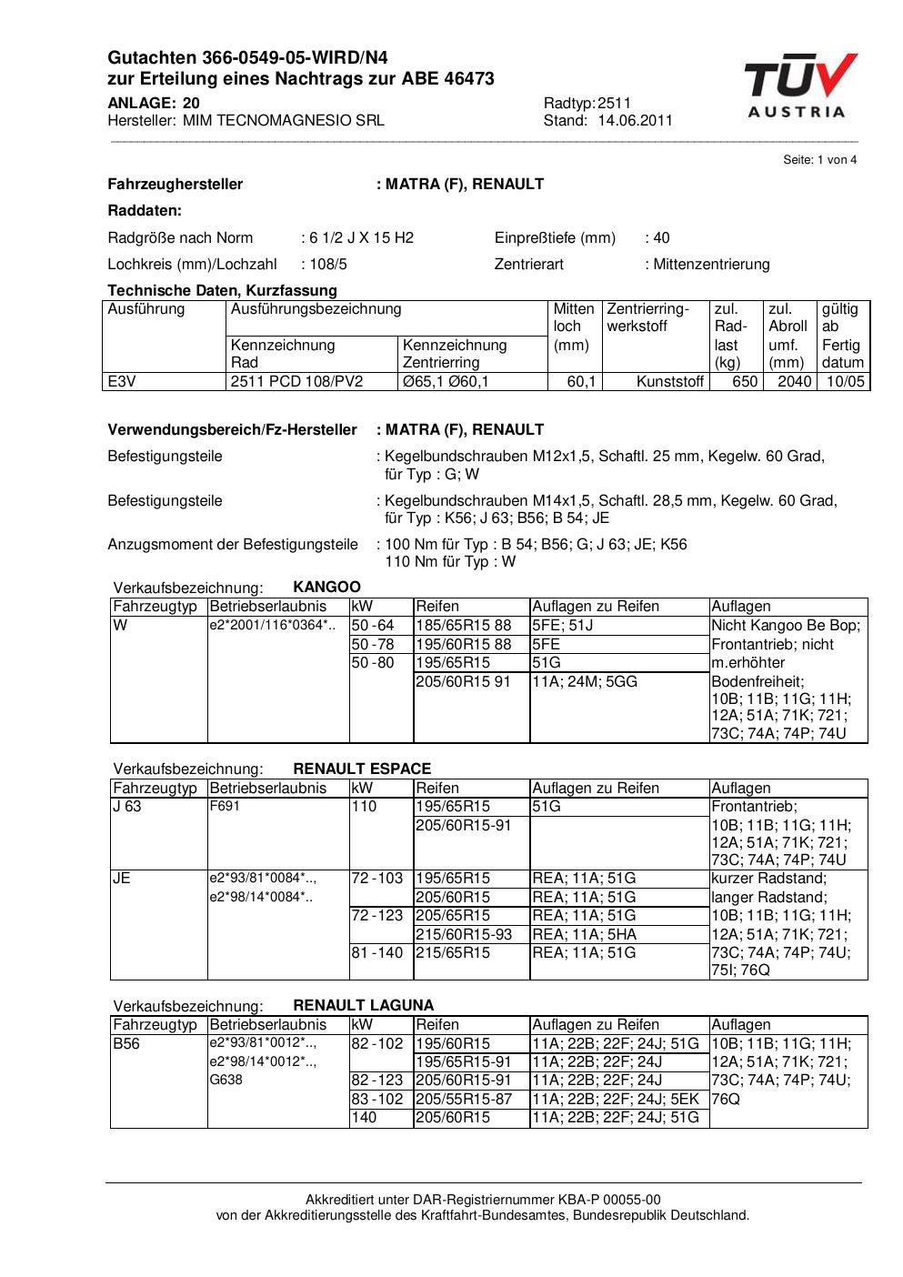 Dieses Gutachten (abe) bezieht sich auf die Alufelge MIM 2511 in der Ausführung ET 0, Mittenloch 0 mm (KBA 46473). Im PDF findest du typischerweise zulässige Reifengrößen, Auflagen/Anbauhinweise und – je nach Dokument – Hinweise zur Eintragung.