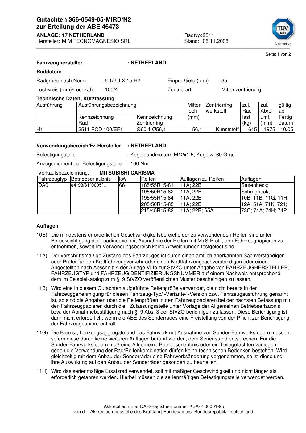 Dieses Gutachten (abe) bezieht sich auf die Alufelge MIM 2511 in der Ausführung ET 0, Mittenloch 0 mm (KBA 46473). Im PDF findest du typischerweise zulässige Reifengrößen, Auflagen/Anbauhinweise und – je nach Dokument – Hinweise zur Eintragung.