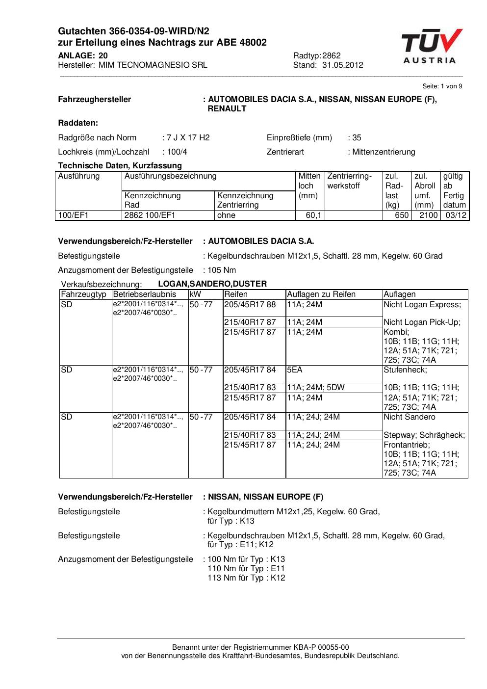 Dieses abe der Marke MIM stammt vom jeweiligen Hersteller, Importeur oder einer Prüforganisation. Felgengutachten.de beansprucht hieran keine eigenen Urheber-, Nutzungs- oder sonstigen Schutzrechte. Soweit das Dokument urheber- oder leistungsschutzrechtlich geschützt ist, verbleiben die Rechte beim jeweiligen Rechteinhaber. Die Bereitstellung erfolgt ausschließlich zu Informationszwecken für Endnutzer, z. B. zur Vorlage bei Prüfstellen oder zur eigenen Fahrzeugdokumentation.