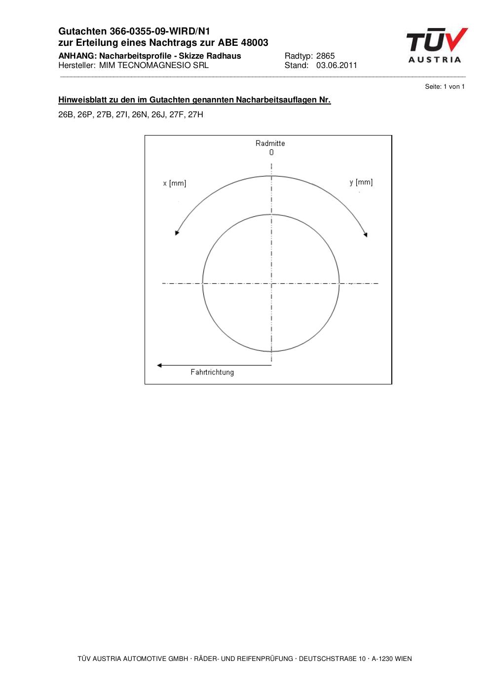 Dieses Gutachten (abe) bezieht sich auf die Alufelge MIM TECNOMAGNESIO SRL 2865 in der Ausführung ET 0, Mittenloch 0 mm (KBA 48003). Im PDF findest du typischerweise zulässige Reifengrößen, Auflagen/Anbauhinweise und – je nach Dokument – Hinweise zur Eintragung.