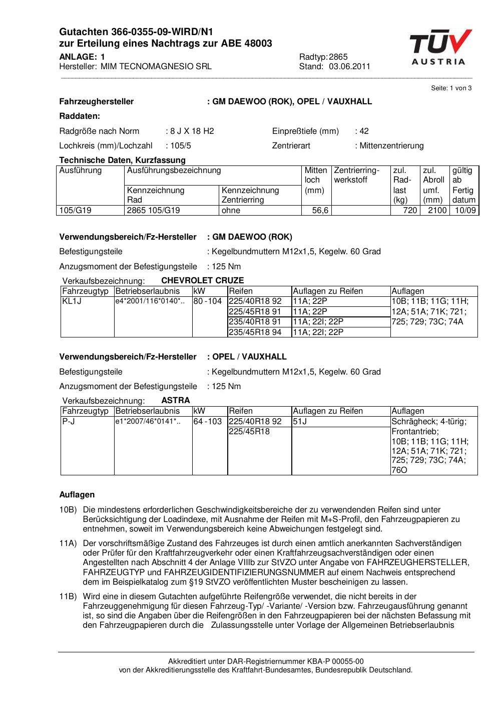 Dieses Gutachten (abe) bezieht sich auf die Alufelge MIM TECNOMAGNESIO SRL 2865 in der Ausführung ET 0, Mittenloch 0 mm (KBA 48003). Im PDF findest du typischerweise zulässige Reifengrößen, Auflagen/Anbauhinweise und – je nach Dokument – Hinweise zur Eintragung.