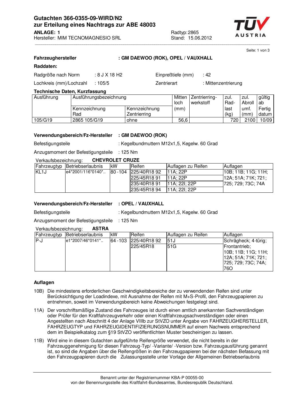 Dieses Gutachten (abe) bezieht sich auf die Alufelge MIM TECNOMAGNESIO SRL 2865 in der Ausführung ET 0, Mittenloch 0 mm (KBA 48003). Im PDF findest du typischerweise zulässige Reifengrößen, Auflagen/Anbauhinweise und – je nach Dokument – Hinweise zur Eintragung.