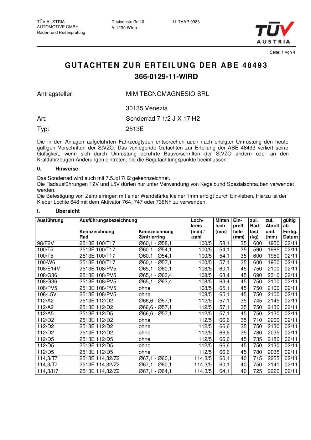 Dieses abe der Marke MIM stammt vom jeweiligen Hersteller, Importeur oder einer Prüforganisation. Felgengutachten.de beansprucht hieran keine eigenen Urheber-, Nutzungs- oder sonstigen Schutzrechte. Soweit das Dokument urheber- oder leistungsschutzrechtlich geschützt ist, verbleiben die Rechte beim jeweiligen Rechteinhaber. Die Bereitstellung erfolgt ausschließlich zu Informationszwecken für Endnutzer, z. B. zur Vorlage bei Prüfstellen oder zur eigenen Fahrzeugdokumentation.