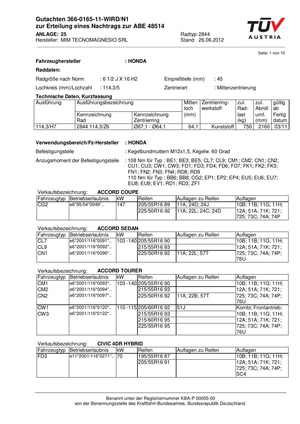 Dieses Gutachten (abe) bezieht sich auf die Alufelge MIM 2844 in der Ausführung ET 0, Mittenloch 0 mm (KBA 48514). Im PDF findest du typischerweise zulässige Reifengrößen, Auflagen/Anbauhinweise und – je nach Dokument – Hinweise zur Eintragung.