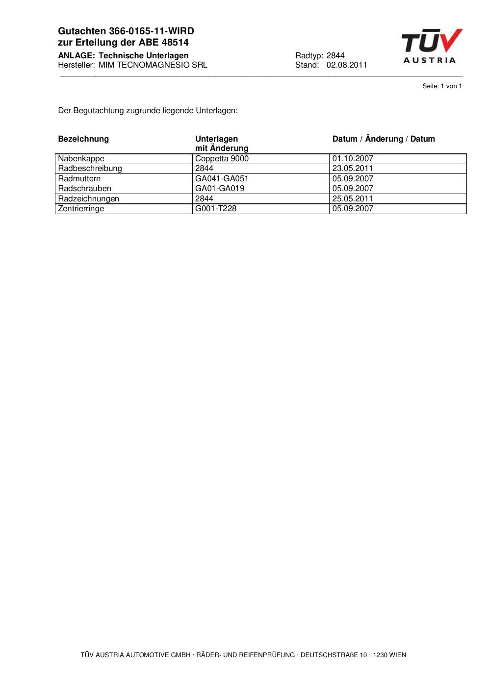 Dieses Gutachten (abe) bezieht sich auf die Alufelge MIM 2844 in der Ausführung ET 0, Mittenloch 0 mm (KBA 48514). Im PDF findest du typischerweise zulässige Reifengrößen, Auflagen/Anbauhinweise und – je nach Dokument – Hinweise zur Eintragung.