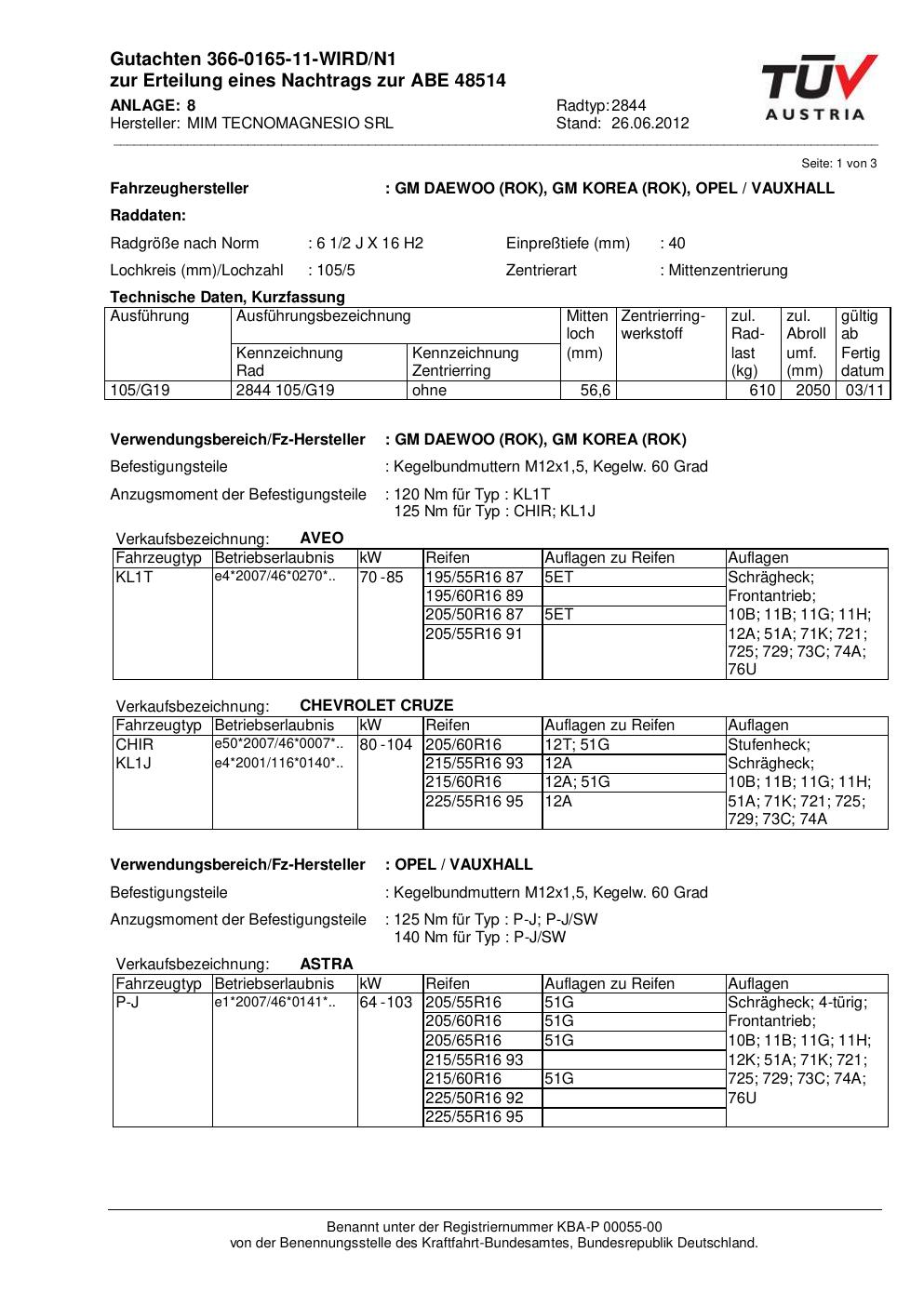 Dieses Gutachten (abe) bezieht sich auf die Alufelge MIM 2844 in der Ausführung ET 0, Mittenloch 0 mm (KBA 48514). Im PDF findest du typischerweise zulässige Reifengrößen, Auflagen/Anbauhinweise und – je nach Dokument – Hinweise zur Eintragung.