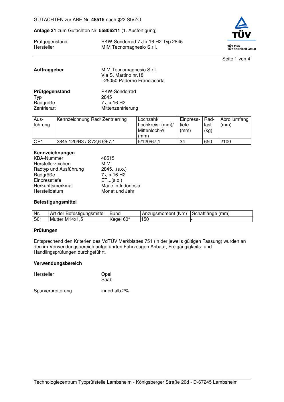 Dieses Gutachten (abe) bezieht sich auf die Alufelge MIM Tecnomagnesio S.r.l. 2845 in der Ausführung ET 0, Mittenloch 0 mm (KBA 48515). Im PDF findest du typischerweise zulässige Reifengrößen, Auflagen/Anbauhinweise und – je nach Dokument – Hinweise zur Eintragung.