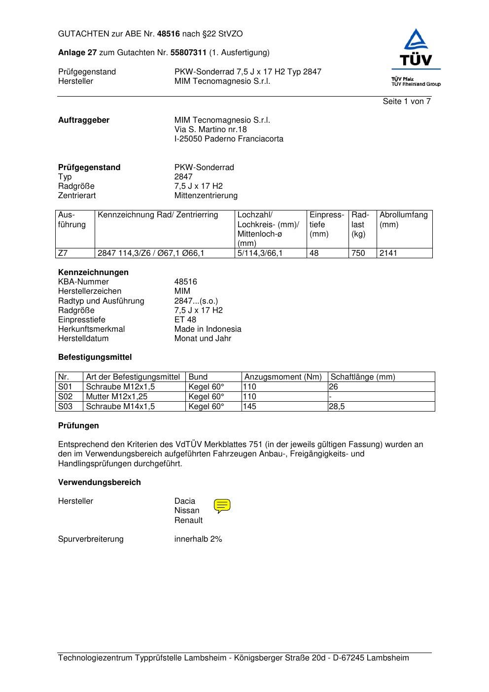 Dieses Gutachten (abe) bezieht sich auf die Alufelge MIM 2847 in der Ausführung ET 0, Mittenloch 0 mm (KBA 48516). Im PDF findest du typischerweise zulässige Reifengrößen, Auflagen/Anbauhinweise und – je nach Dokument – Hinweise zur Eintragung.