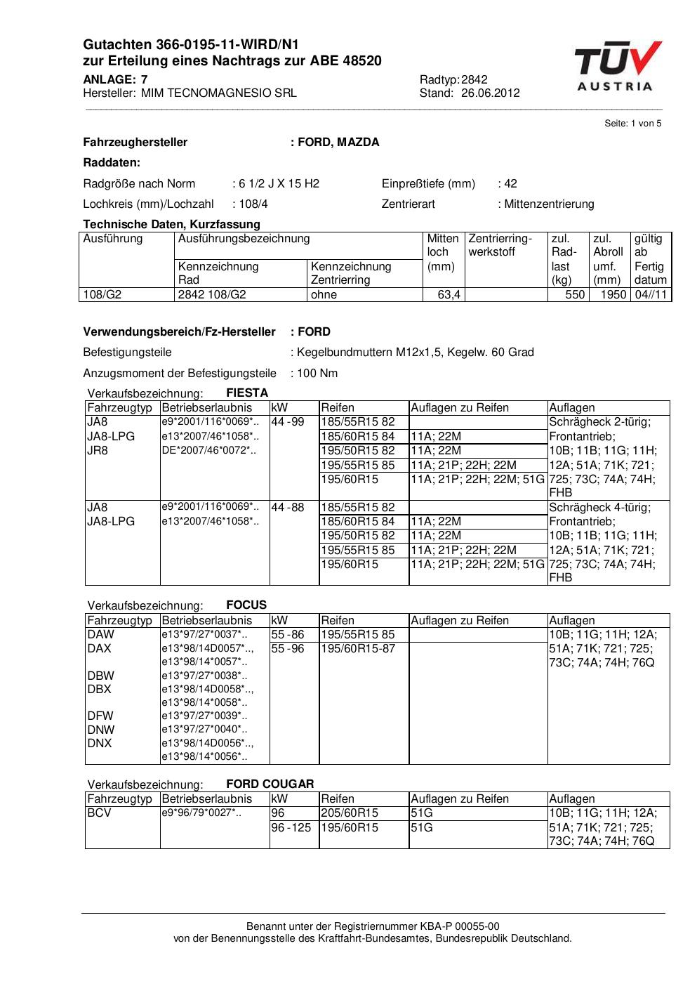 Dieses Gutachten (abe) bezieht sich auf die Alufelge MIM 2842 in der Ausführung ET 0, Mittenloch 0 mm (KBA 48520). Im PDF findest du typischerweise zulässige Reifengrößen, Auflagen/Anbauhinweise und – je nach Dokument – Hinweise zur Eintragung.