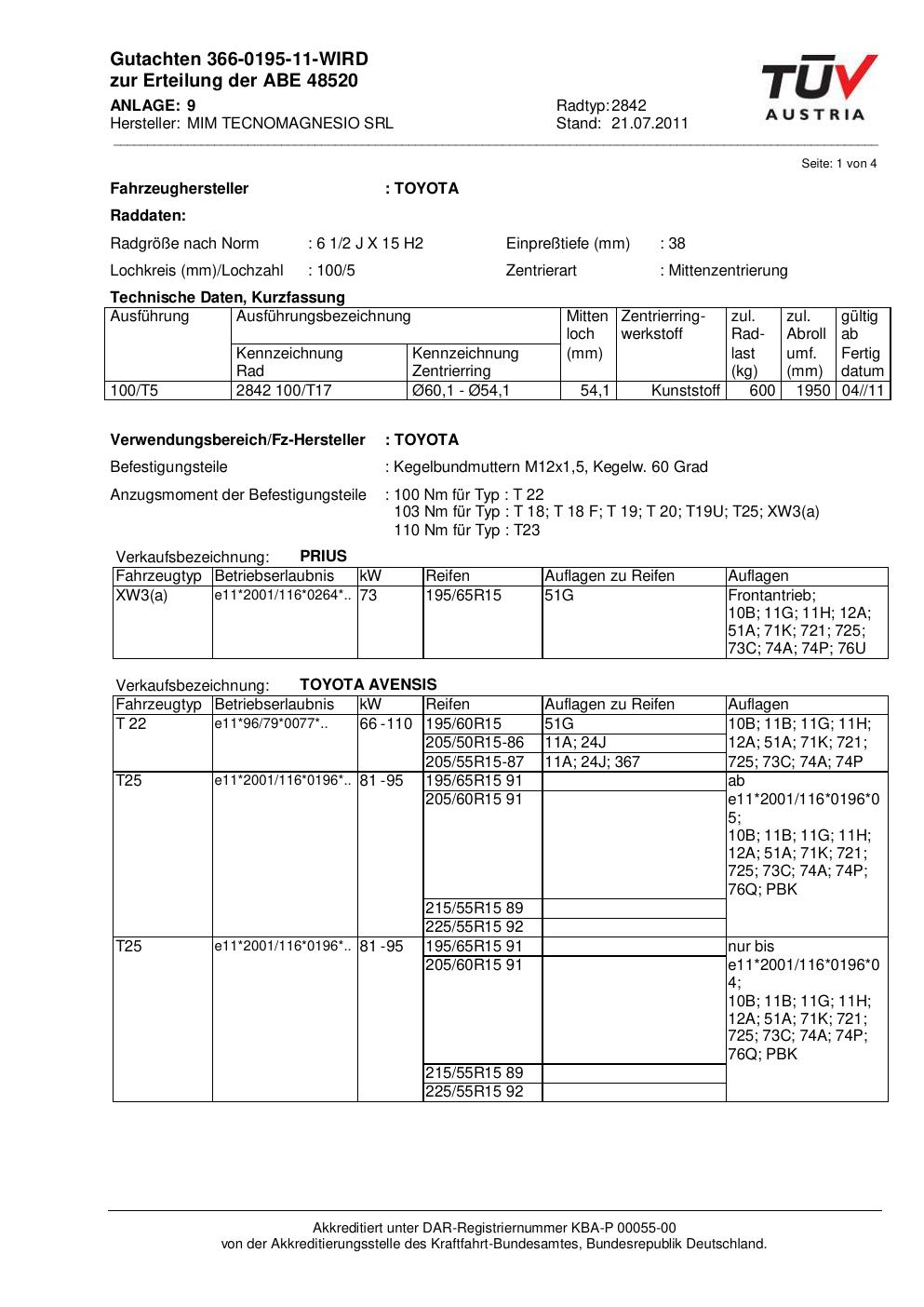 Dieses Gutachten (abe) bezieht sich auf die Alufelge MIM 2842 in der Ausführung ET 0, Mittenloch 0 mm (KBA 48520). Im PDF findest du typischerweise zulässige Reifengrößen, Auflagen/Anbauhinweise und – je nach Dokument – Hinweise zur Eintragung.