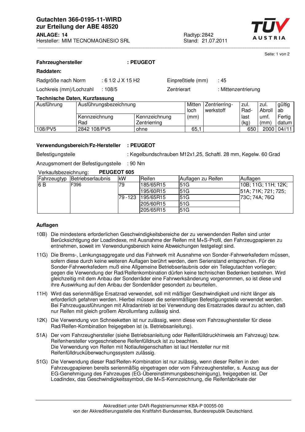 Dieses Gutachten (abe) bezieht sich auf die Alufelge MIM 2842 in der Ausführung ET 0, Mittenloch 0 mm (KBA 48520). Im PDF findest du typischerweise zulässige Reifengrößen, Auflagen/Anbauhinweise und – je nach Dokument – Hinweise zur Eintragung.