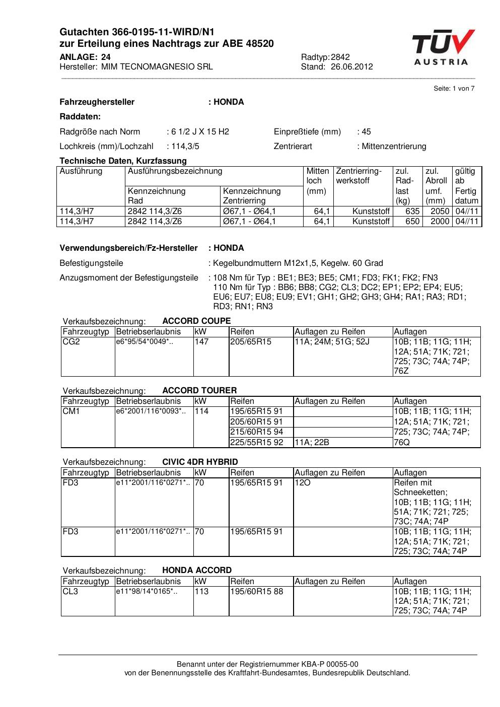 Dieses Gutachten (abe) bezieht sich auf die Alufelge MIM 2842 in der Ausführung ET 0, Mittenloch 0 mm (KBA 48520). Im PDF findest du typischerweise zulässige Reifengrößen, Auflagen/Anbauhinweise und – je nach Dokument – Hinweise zur Eintragung.