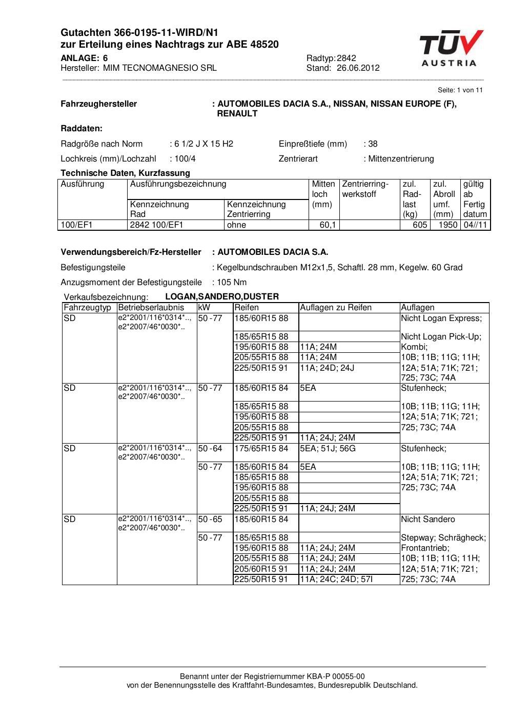 Dieses Gutachten (abe) bezieht sich auf die Alufelge MIM 2842 in der Ausführung ET 0, Mittenloch 0 mm (KBA 48520). Im PDF findest du typischerweise zulässige Reifengrößen, Auflagen/Anbauhinweise und – je nach Dokument – Hinweise zur Eintragung.