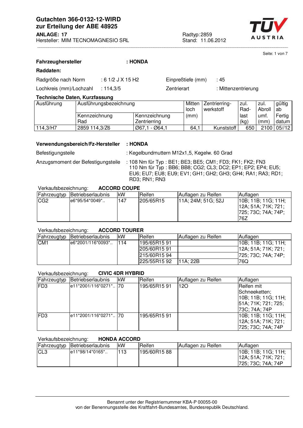 Dieses Gutachten (abe) bezieht sich auf die Alufelge MIM 2859 in der Ausführung ET 0, Mittenloch 0 mm (KBA 48925). Im PDF findest du typischerweise zulässige Reifengrößen, Auflagen/Anbauhinweise und – je nach Dokument – Hinweise zur Eintragung.