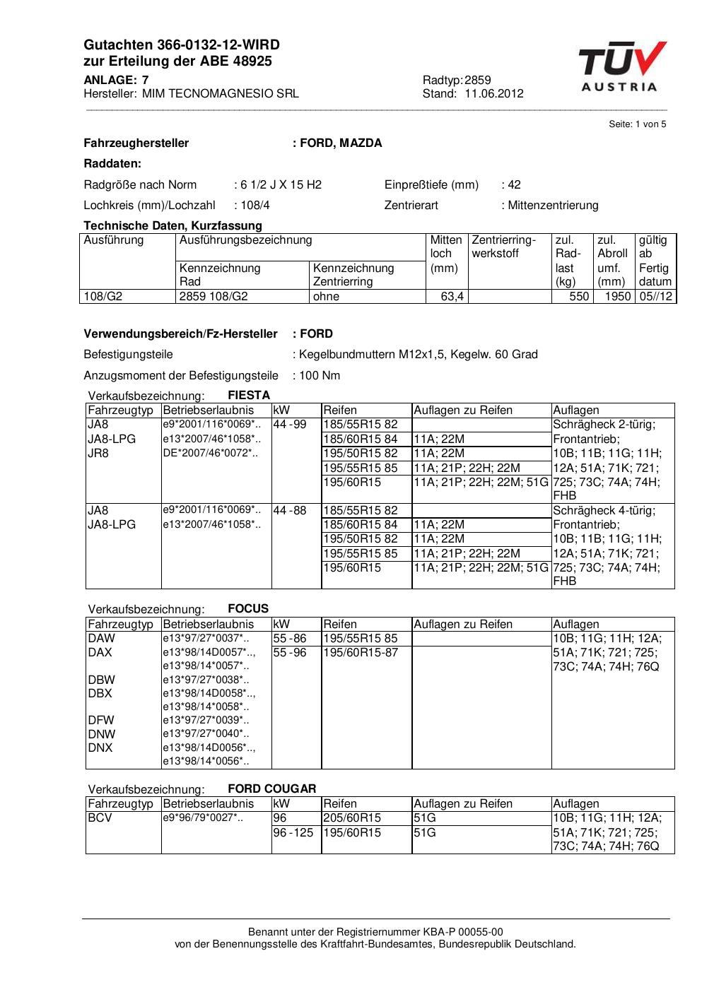 Felgengutachten / abe für Alufelgen MIM TECNOMAGNESIO SRL 2859 (ET 0, Mittenloch 0 mm) mit KBA 48925 (Zertifikatsnummer 48925). Hier kostenlos als PDF herunterladen. Der Download-Link ist 24 Stunden gültig und kann bis zu zwei Mal verwendet werden.
