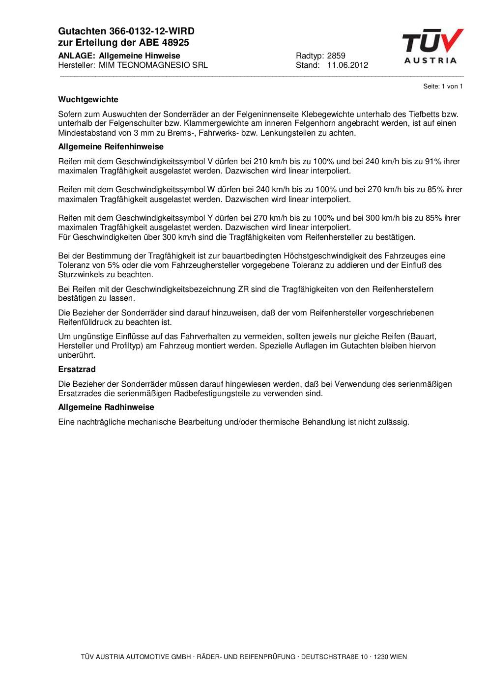 Dieses Gutachten (abe) bezieht sich auf die Alufelge MIM TECNOMAGNESIO SRL 2859 in der Ausführung ET 0, Mittenloch 0 mm (KBA 48925). Im PDF findest du typischerweise zulässige Reifengrößen, Auflagen/Anbauhinweise und – je nach Dokument – Hinweise zur Eintragung.