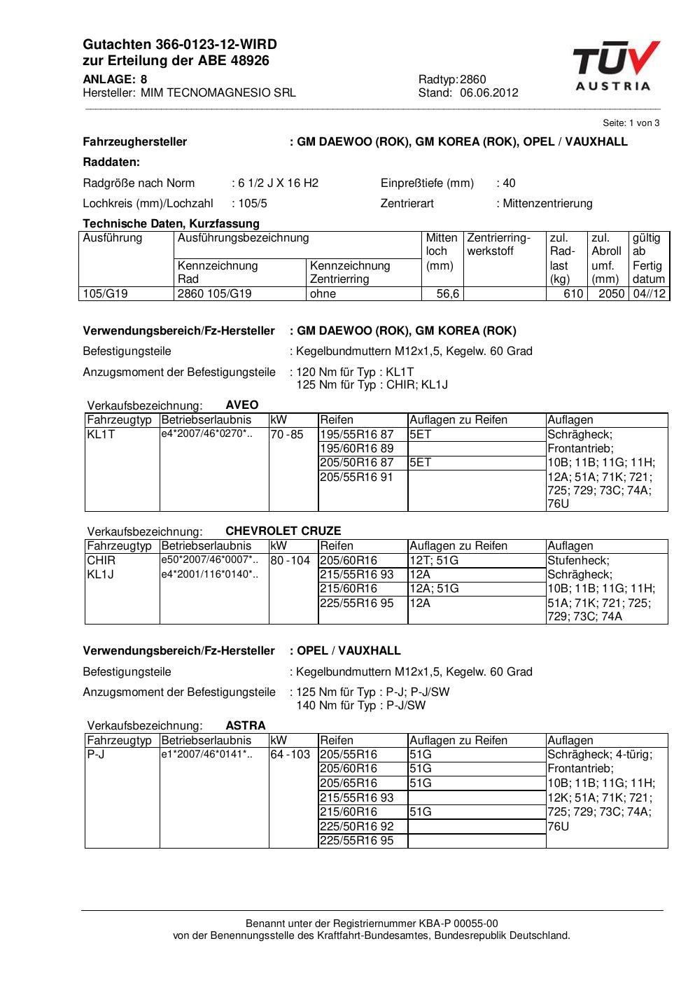 Felgengutachten / abe für Alufelgen MIM TECNOMAGNESIO SRL 2860 (ET 0, Mittenloch 0 mm) mit KBA 48926 (Zertifikatsnummer 48926). Hier kostenlos als PDF herunterladen. Der Download-Link ist 24 Stunden gültig und kann bis zu zwei Mal verwendet werden.