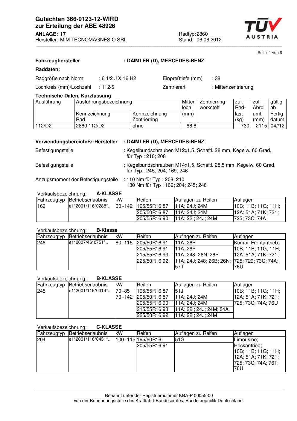 Dieses Gutachten (abe) bezieht sich auf die Alufelge MIM TECNOMAGNESIO SRL 2860 in der Ausführung ET 0, Mittenloch 0 mm (KBA 48926). Im PDF findest du typischerweise zulässige Reifengrößen, Auflagen/Anbauhinweise und – je nach Dokument – Hinweise zur Eintragung.