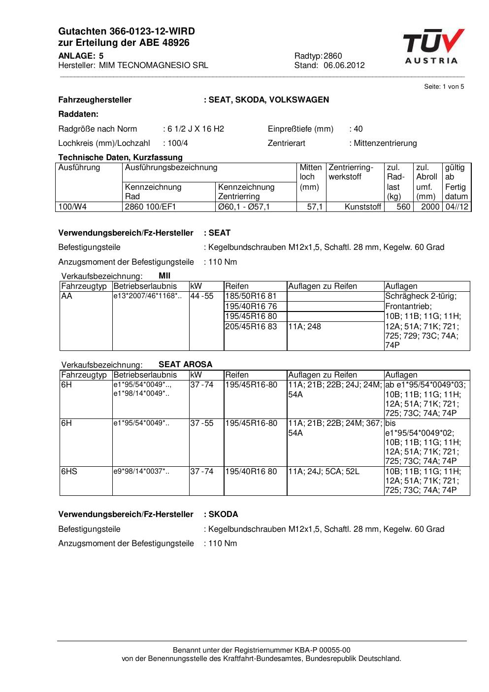 Felgengutachten / abe für Alufelgen MIM TECNOMAGNESIO SRL 2860 (ET 0, Mittenloch 0 mm) mit KBA 48926 (Zertifikatsnummer 48926). Hier kostenlos als PDF herunterladen. Der Download-Link ist 24 Stunden gültig und kann bis zu zwei Mal verwendet werden.