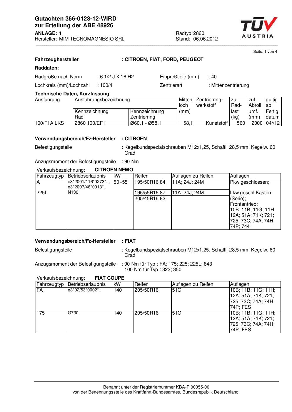 Dieses Gutachten (abe) bezieht sich auf die Alufelge MIM TECNOMAGNESIO SRL 2860 in der Ausführung ET 0, Mittenloch 0 mm (KBA 48926). Im PDF findest du typischerweise zulässige Reifengrößen, Auflagen/Anbauhinweise und – je nach Dokument – Hinweise zur Eintragung.