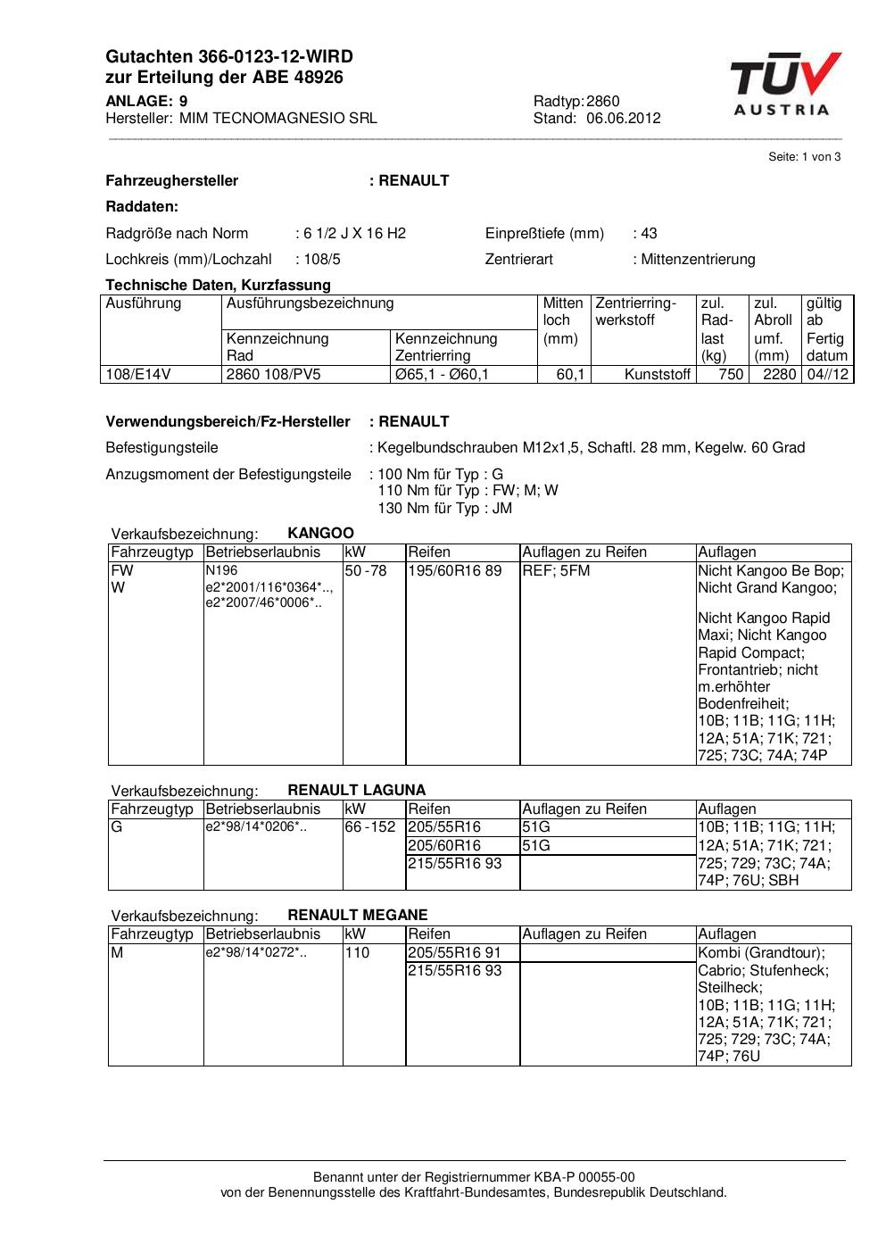 Felgengutachten / abe für Alufelgen MIM TECNOMAGNESIO SRL 2860 (ET 0, Mittenloch 0 mm) mit KBA 48926 (Zertifikatsnummer 48926). Hier kostenlos als PDF herunterladen. Der Download-Link ist 24 Stunden gültig und kann bis zu zwei Mal verwendet werden.