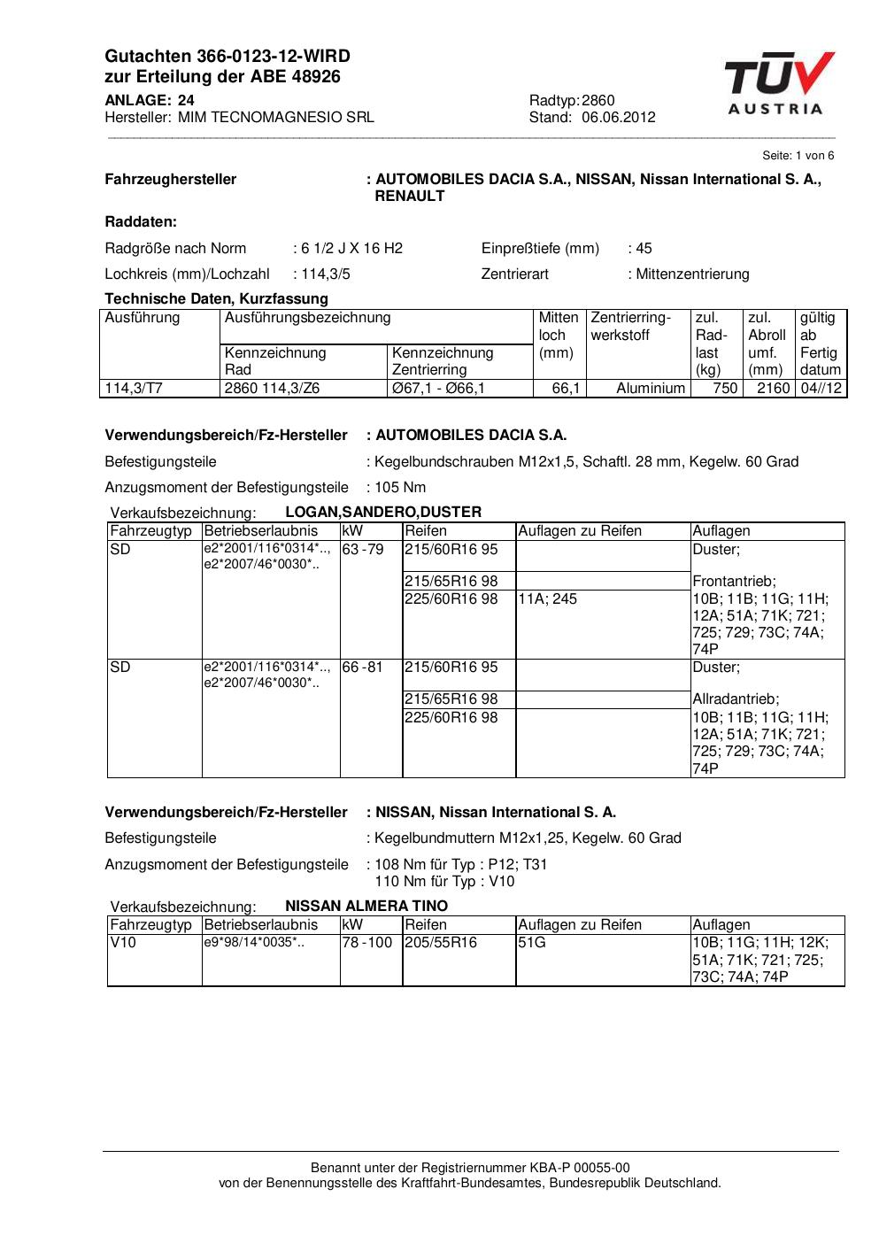 Felgengutachten / abe für Alufelgen MIM TECNOMAGNESIO SRL 2860 (ET 0, Mittenloch 0 mm) mit KBA 48926 (Zertifikatsnummer 48926). Hier kostenlos als PDF herunterladen. Der Download-Link ist 24 Stunden gültig und kann bis zu zwei Mal verwendet werden.
