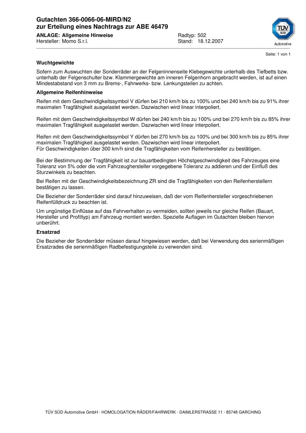 Dieses Gutachten (abe) bezieht sich auf die Alufelge Momo 502 in der Ausführung ET 0, Mittenloch 0 mm (KBA 46479). Im PDF findest du typischerweise zulässige Reifengrößen, Auflagen/Anbauhinweise und – je nach Dokument – Hinweise zur Eintragung.