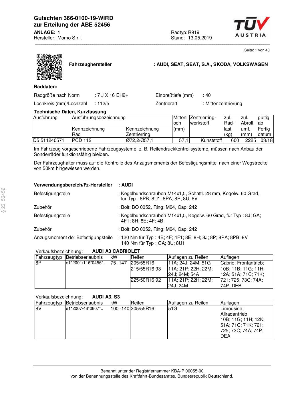 Dieses Gutachten (ABE) bezieht sich auf die Alufelge Momo BLADE in der Ausführung 7Jx16 ET 0, Mittenloch 0 mm (KBA 52456). Im PDF findest du typischerweise zulässige Reifengrößen, Auflagen/Anbauhinweise und – je nach Dokument – Hinweise zur Eintragung.