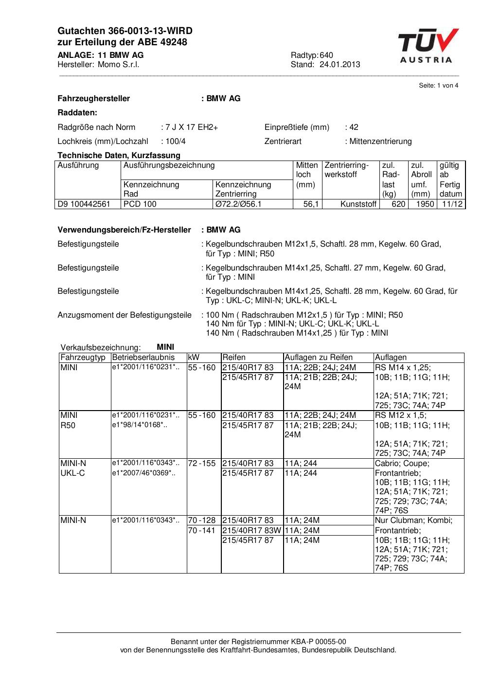 Felgengutachten / ABE für Alufelgen Momo EUROPE (7Jx17 ET 0, Mittenloch 0 mm) mit KBA 49248 (Zertifikatsnummer 366-0013-13-WIRD__Anlage_11). Hier kostenlos als PDF herunterladen. Der Download-Link ist 24 Stunden gültig und kann bis zu zwei Mal verwendet werden.