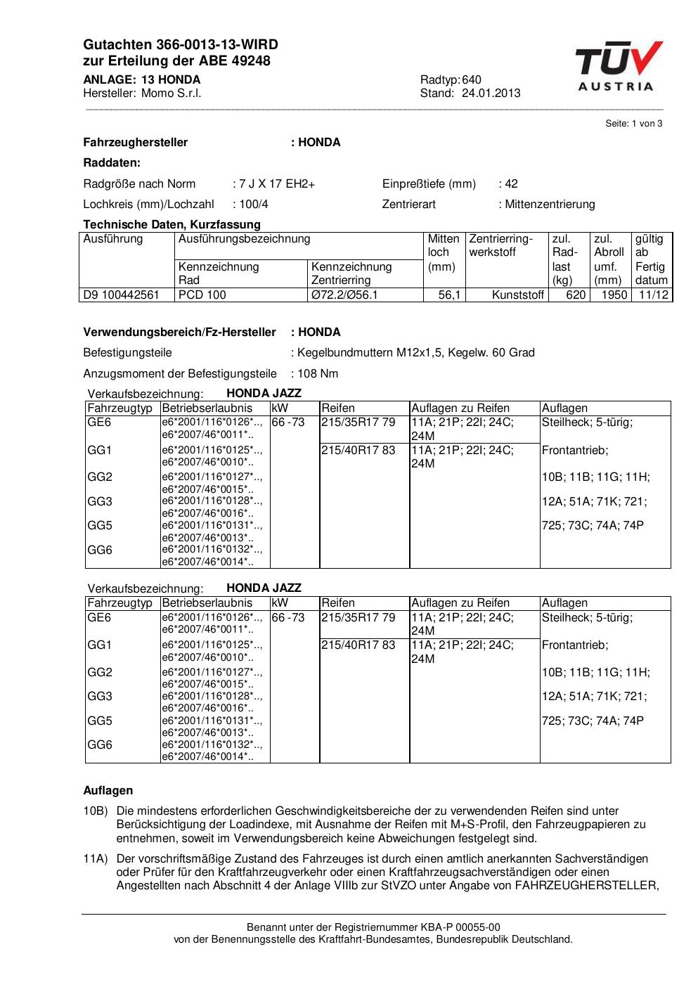 Dieses Gutachten (ABE) bezieht sich auf die Alufelge Momo EUROPE in der Ausführung 7Jx17 ET 0, Mittenloch 0 mm (KBA 49248). Im PDF findest du typischerweise zulässige Reifengrößen, Auflagen/Anbauhinweise und – je nach Dokument – Hinweise zur Eintragung.