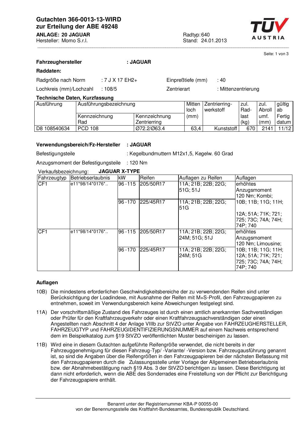 Dieses Gutachten (ABE) bezieht sich auf die Alufelge Momo EUROPE in der Ausführung 7Jx17 ET 0, Mittenloch 0 mm (KBA 49248). Im PDF findest du typischerweise zulässige Reifengrößen, Auflagen/Anbauhinweise und – je nach Dokument – Hinweise zur Eintragung.