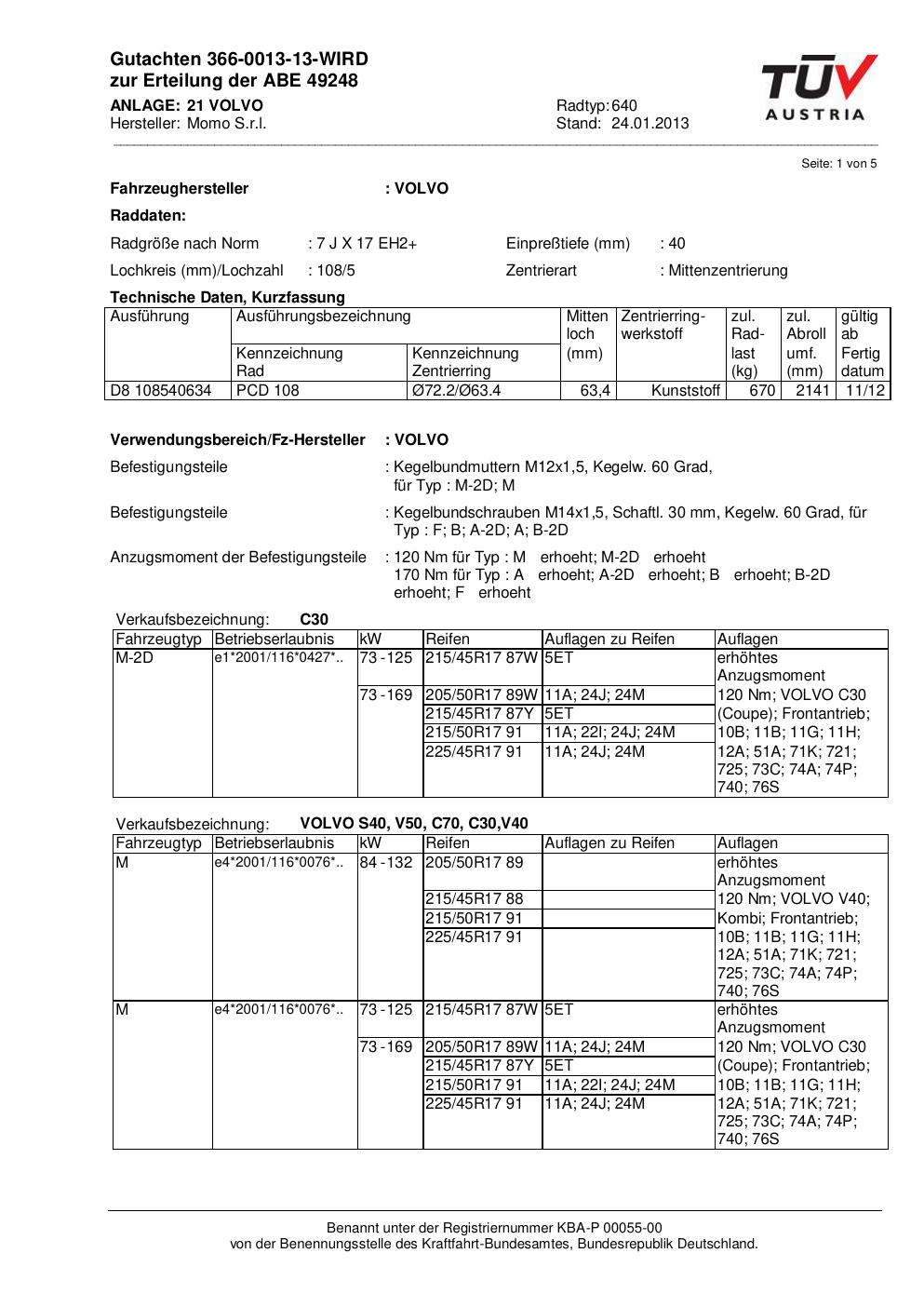 Felgengutachten / ABE für Alufelgen Momo EUROPE (7Jx17 ET 0, Mittenloch 0 mm) mit KBA 49248 (Zertifikatsnummer 366-0013-13-WIRD__Anlage_21). Hier kostenlos als PDF herunterladen. Der Download-Link ist 24 Stunden gültig und kann bis zu zwei Mal verwendet werden.