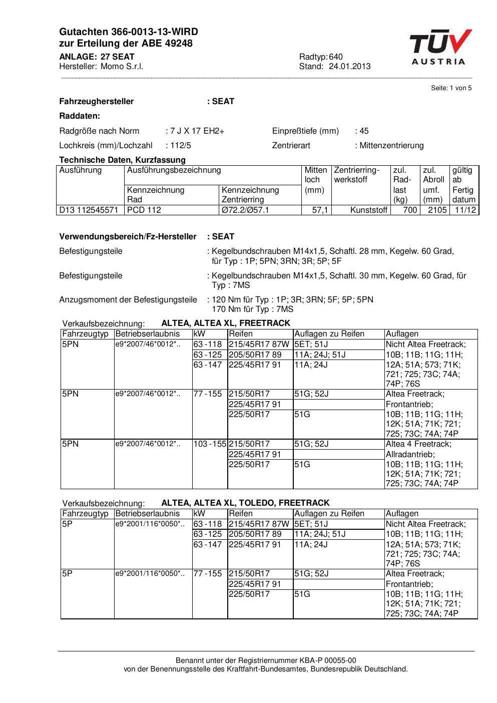Felgengutachten / ABE für Alufelgen Momo EUROPE (7Jx17 ET 0, Mittenloch 0 mm) mit KBA 49248 (Zertifikatsnummer 366-0013-13-WIRD__Anlage_27). Hier kostenlos als PDF herunterladen. Der Download-Link ist 24 Stunden gültig und kann bis zu zwei Mal verwendet werden.