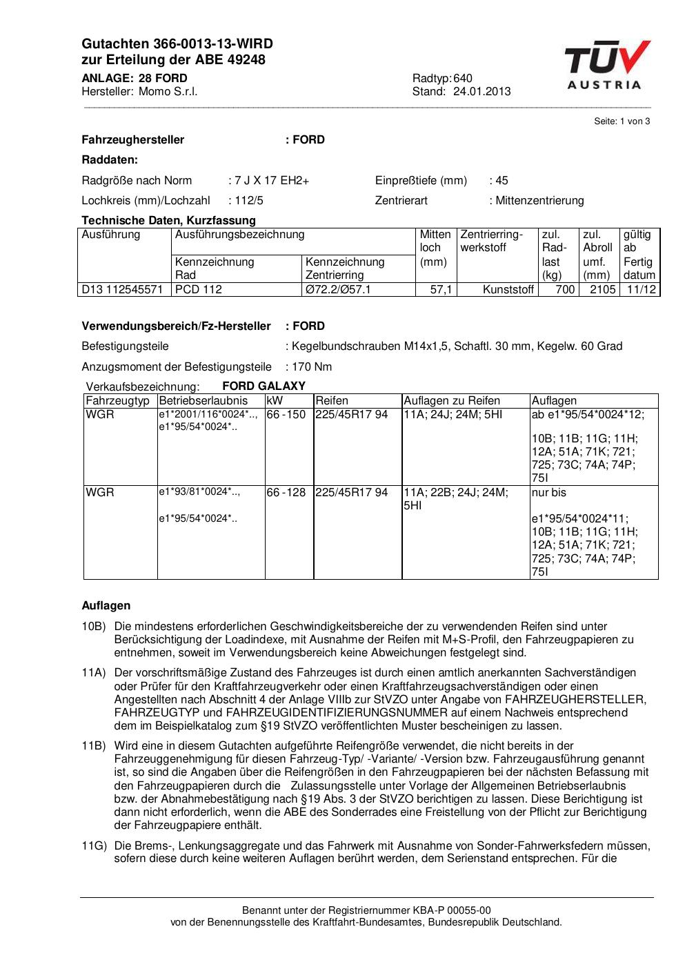 Dieses Gutachten (ABE) bezieht sich auf die Alufelge Momo EUROPE in der Ausführung 7Jx17 ET 0, Mittenloch 0 mm (KBA 49248). Im PDF findest du typischerweise zulässige Reifengrößen, Auflagen/Anbauhinweise und – je nach Dokument – Hinweise zur Eintragung.