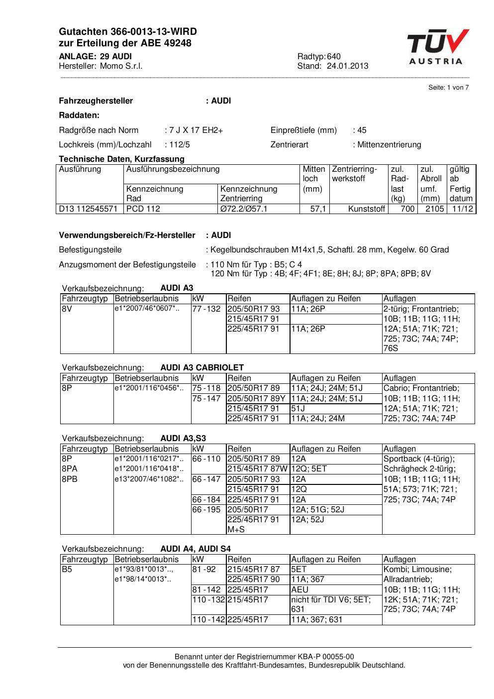Felgengutachten / ABE für Alufelgen Momo EUROPE (7Jx17 ET 0, Mittenloch 0 mm) mit KBA 49248 (Zertifikatsnummer 366-0013-13-WIRD__Anlage_29). Hier kostenlos als PDF herunterladen. Der Download-Link ist 24 Stunden gültig und kann bis zu zwei Mal verwendet werden.