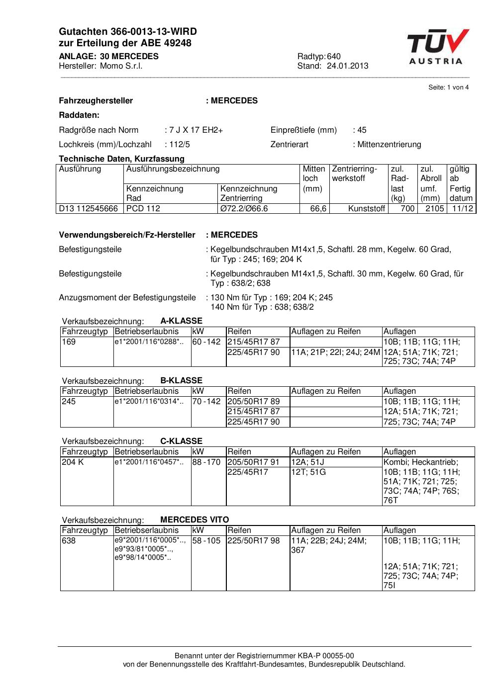 Dieses Gutachten (ABE) bezieht sich auf die Alufelge Momo EUROPE in der Ausführung 7Jx17 ET 0, Mittenloch 0 mm (KBA 49248). Im PDF findest du typischerweise zulässige Reifengrößen, Auflagen/Anbauhinweise und – je nach Dokument – Hinweise zur Eintragung.