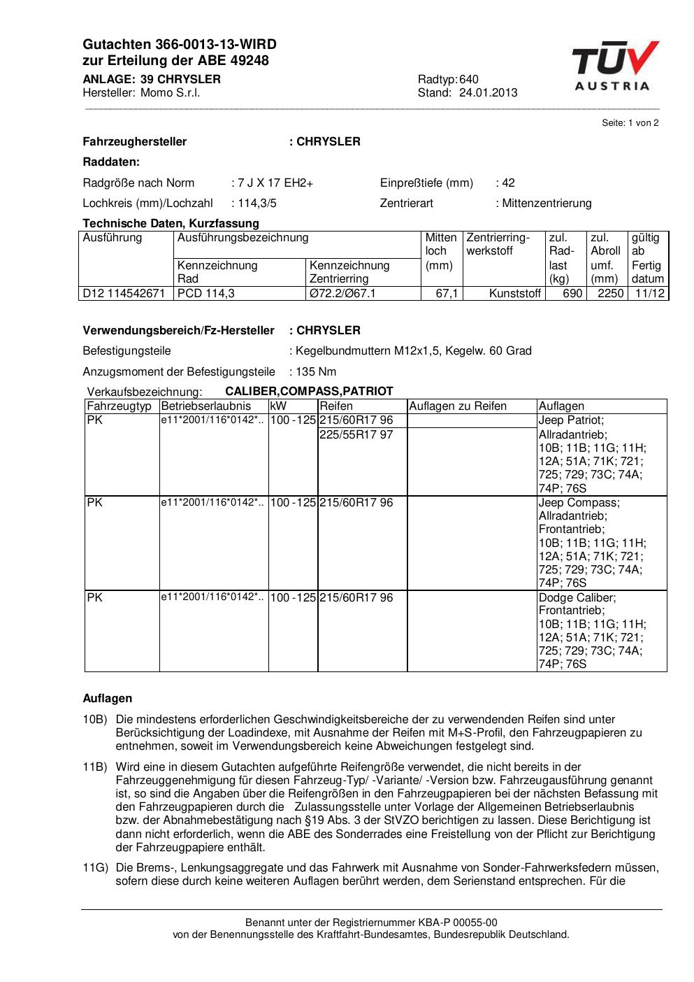 Dieses Gutachten (ABE) bezieht sich auf die Alufelge Momo EUROPE in der Ausführung 7Jx17 ET 0, Mittenloch 0 mm (KBA 49248). Im PDF findest du typischerweise zulässige Reifengrößen, Auflagen/Anbauhinweise und – je nach Dokument – Hinweise zur Eintragung.