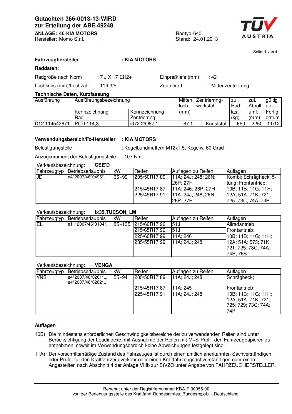 Dieses Gutachten (ABE) bezieht sich auf die Alufelge Momo EUROPE in der Ausführung 7Jx17 ET 0, Mittenloch 0 mm (KBA 49248). Im PDF findest du typischerweise zulässige Reifengrößen, Auflagen/Anbauhinweise und – je nach Dokument – Hinweise zur Eintragung.