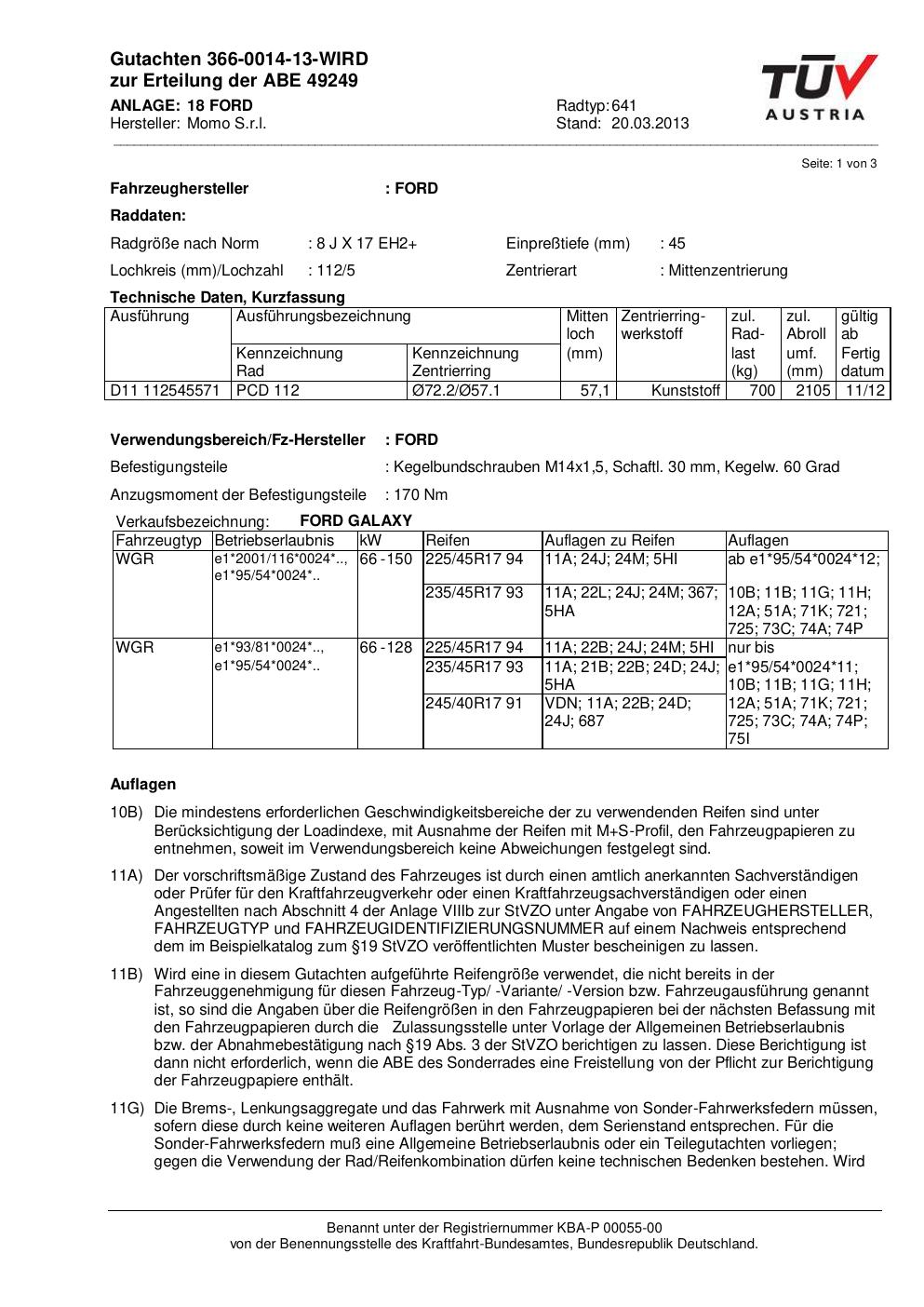 Felgengutachten / ABE für Alufelgen Momo EUROPE (8Jx17 ET 0, Mittenloch 0 mm) mit KBA 49249 (Zertifikatsnummer 366-0014-13-WIRD__Anlage_18). Hier kostenlos als PDF herunterladen. Der Download-Link ist 24 Stunden gültig und kann bis zu zwei Mal verwendet werden.