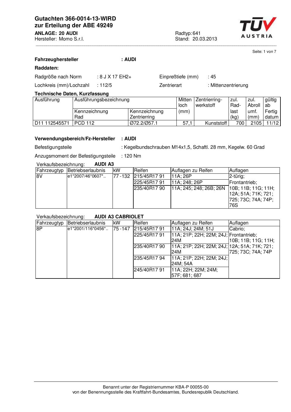 Dieses Gutachten (ABE) bezieht sich auf die Alufelge Momo EUROPE in der Ausführung 8Jx17 ET 0, Mittenloch 0 mm (KBA 49249). Im PDF findest du typischerweise zulässige Reifengrößen, Auflagen/Anbauhinweise und – je nach Dokument – Hinweise zur Eintragung.
