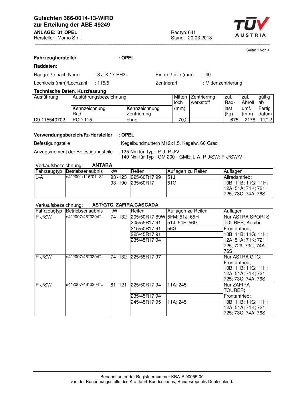 Dieses Gutachten (ABE) bezieht sich auf die Alufelge Momo EUROPE in der Ausführung 8Jx17 ET 0, Mittenloch 0 mm (KBA 49249). Im PDF findest du typischerweise zulässige Reifengrößen, Auflagen/Anbauhinweise und – je nach Dokument – Hinweise zur Eintragung.