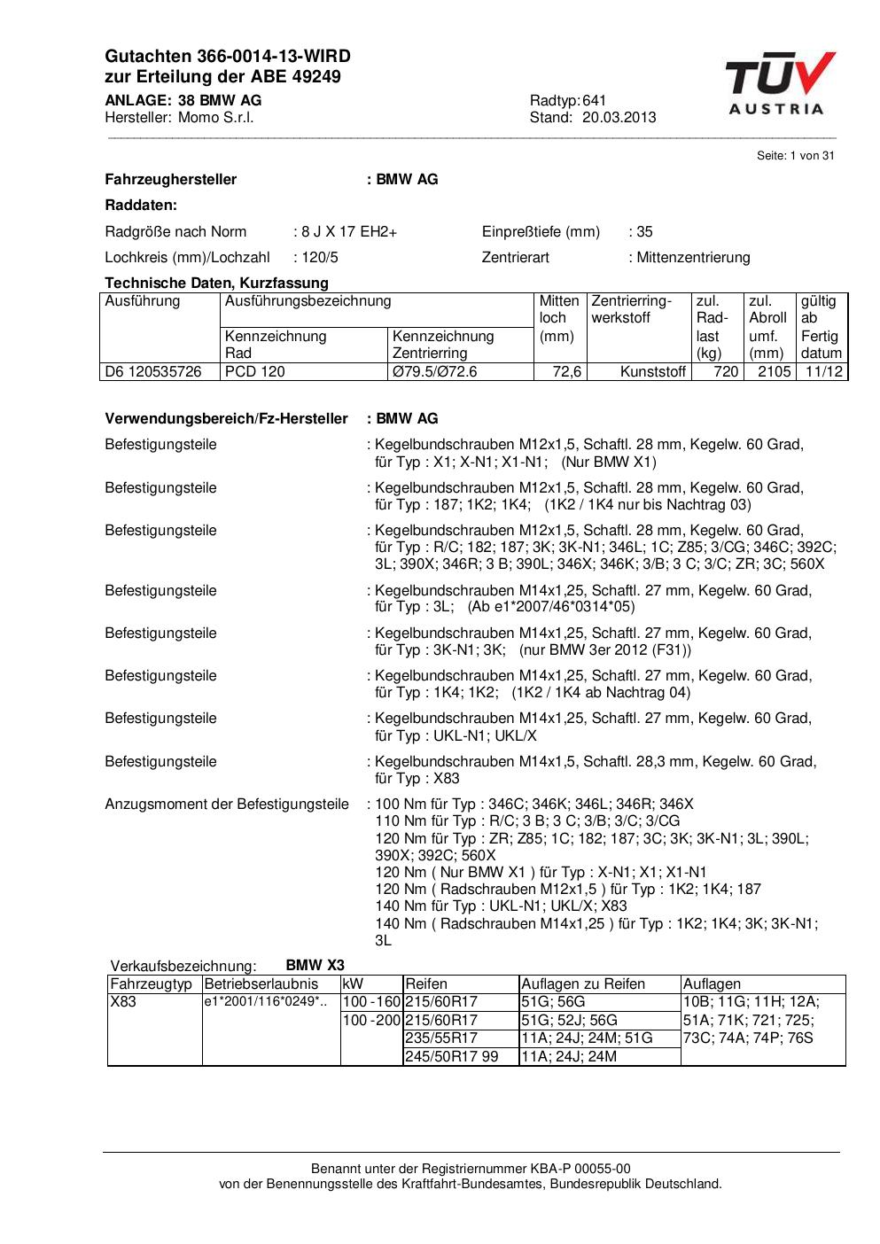 Dieses Gutachten (ABE) bezieht sich auf die Alufelge Momo EUROPE in der Ausführung 8Jx17 ET 0, Mittenloch 0 mm (KBA 49249). Im PDF findest du typischerweise zulässige Reifengrößen, Auflagen/Anbauhinweise und – je nach Dokument – Hinweise zur Eintragung.