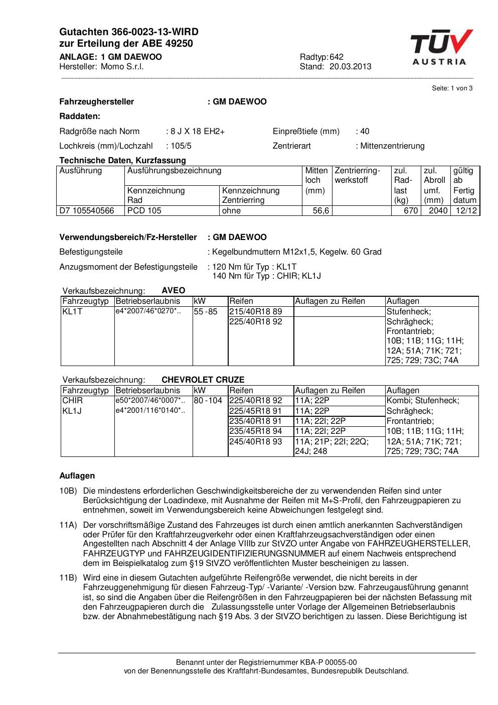 Felgengutachten / ABE für Alufelgen Momo EUROPE (8Jx18 ET 0, Mittenloch 0 mm) mit KBA 49250 (Zertifikatsnummer 366-0023-13-WIRD__Anlage_1). Hier kostenlos als PDF herunterladen. Der Download-Link ist 24 Stunden gültig und kann bis zu zwei Mal verwendet werden.