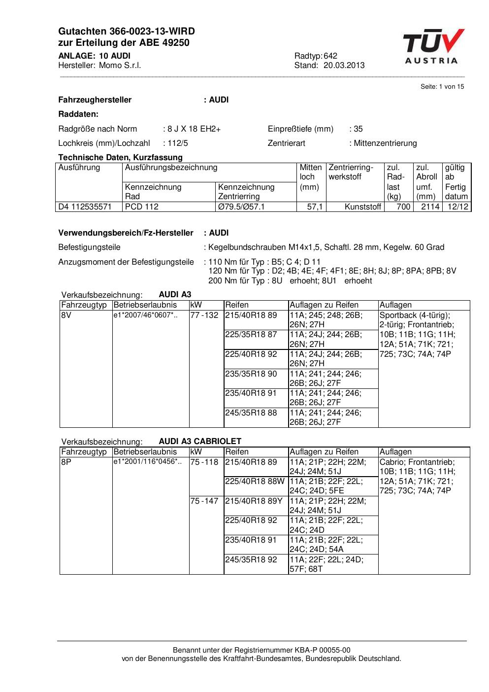 Felgengutachten / ABE für Alufelgen Momo EUROPE (8Jx18 ET 0, Mittenloch 0 mm) mit KBA 49250 (Zertifikatsnummer 366-0023-13-WIRD__Anlage_10). Hier kostenlos als PDF herunterladen. Der Download-Link ist 24 Stunden gültig und kann bis zu zwei Mal verwendet werden.