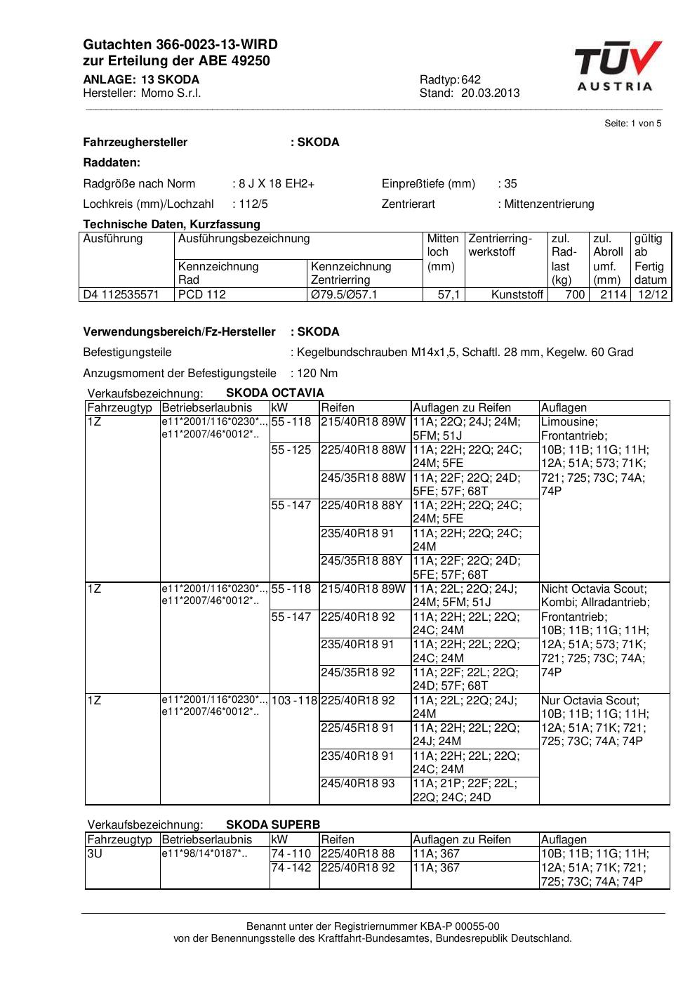 Felgengutachten / ABE für Alufelgen Momo EUROPE (8Jx18 ET 0, Mittenloch 0 mm) mit KBA 49250 (Zertifikatsnummer 366-0023-13-WIRD__Anlage_13). Hier kostenlos als PDF herunterladen. Der Download-Link ist 24 Stunden gültig und kann bis zu zwei Mal verwendet werden.